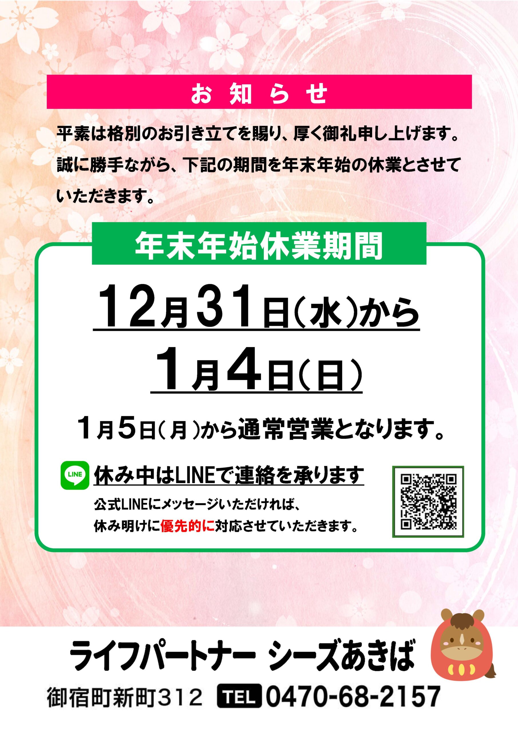年末年始休業期間のお知らせ